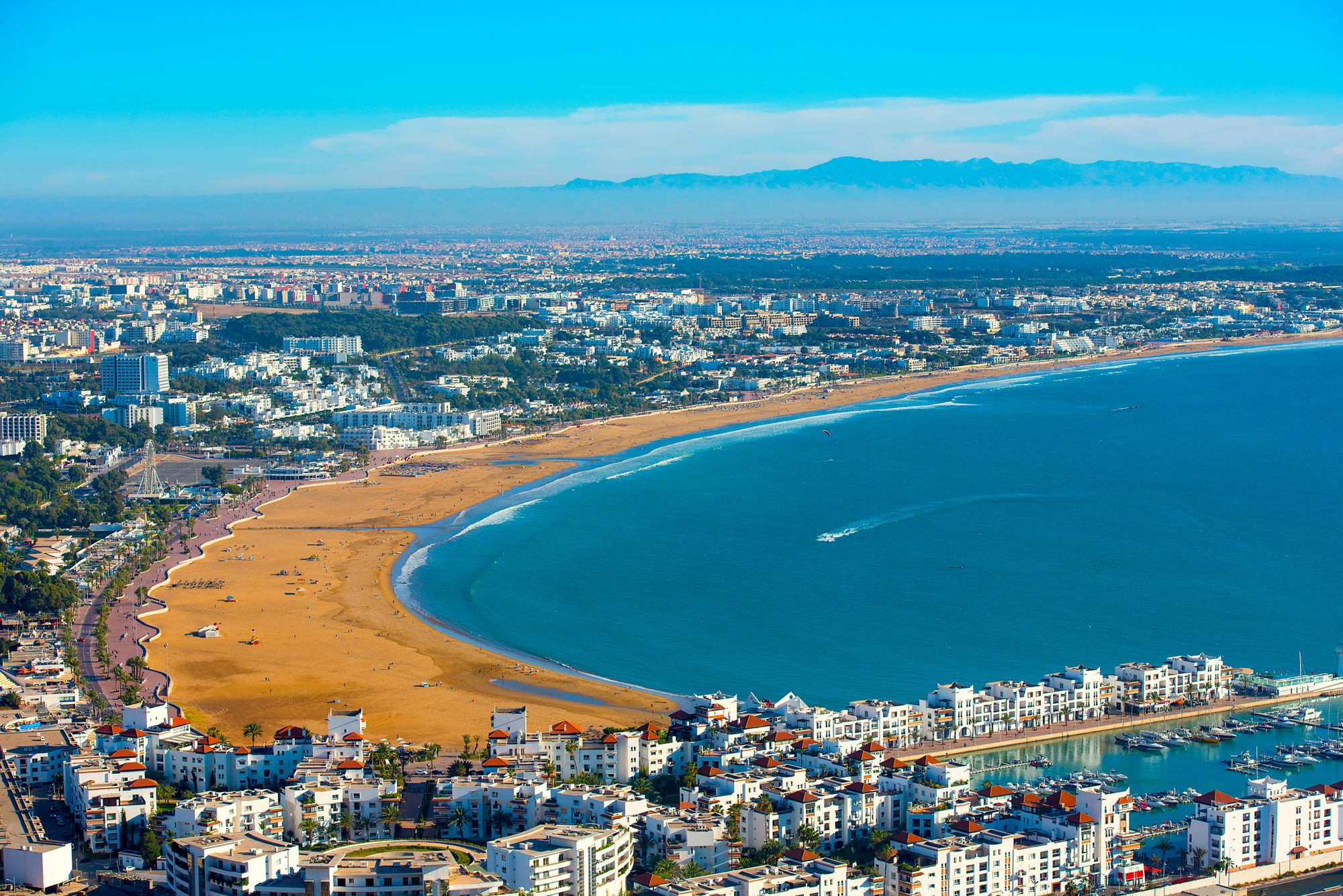 Agadir, ville moderne au bord de l’océan Atlantique, est connue pour sa longue plage, son climat doux toute l’année, sa corniche animée, ses restaurants de fruits de mer, et sa vue panoramique depuis les hauteurs de la Kasbah.